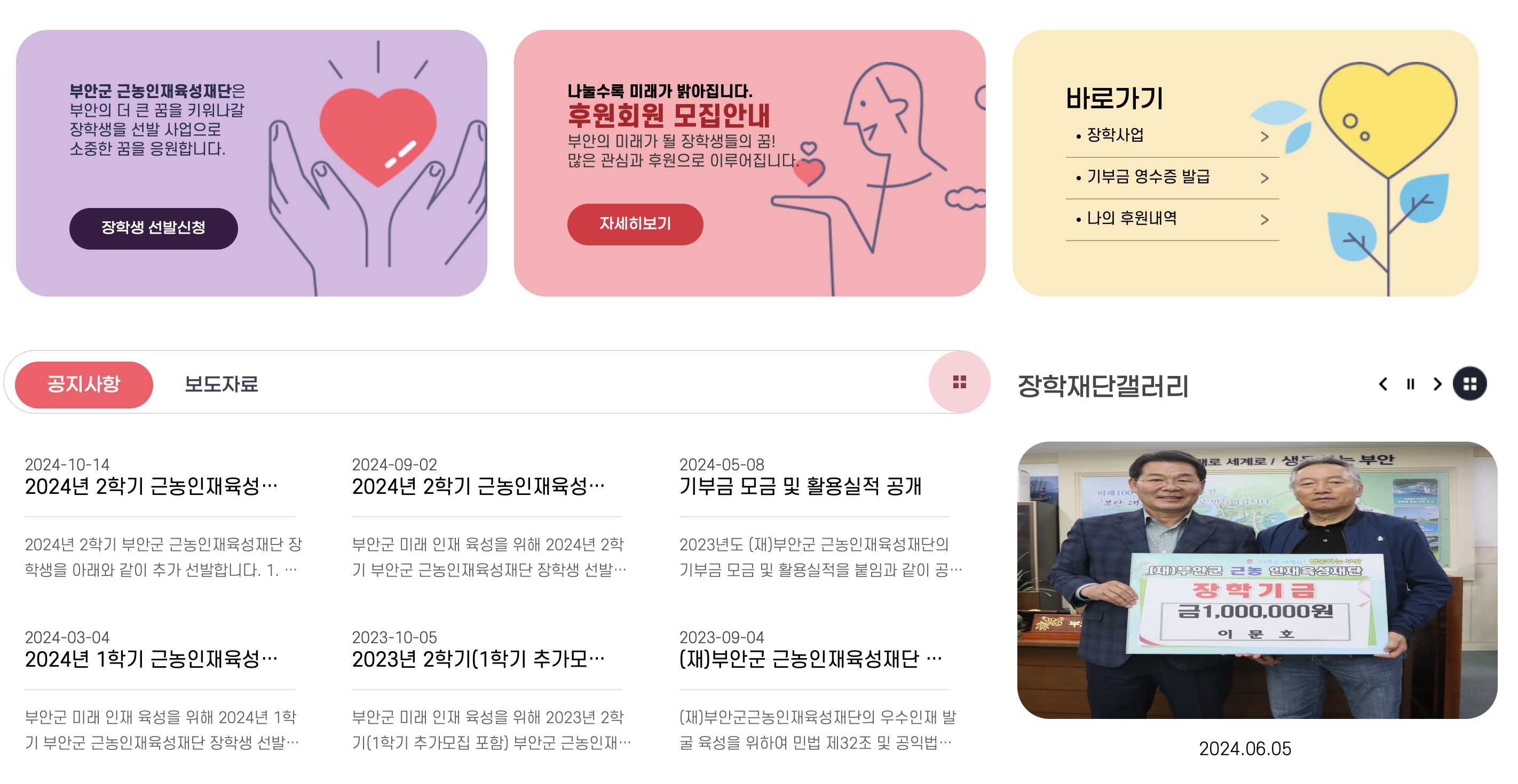 안녕하세요! 오늘은 근농인재육성재단 홈페이지에 대해 자세히 알아보겠습니다. 이 재단은 부안군에서 운영하는 재단법인으로, 지역 인재 육성을 위한 장학사업과 기부금 영수증 발급 등의 서비스를 제공하고 있습니다.